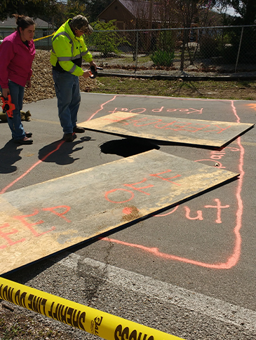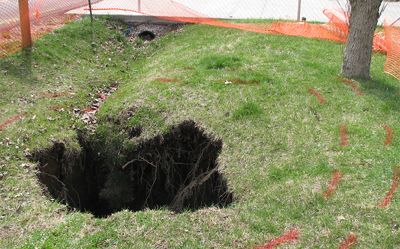 It is important to note that once sinkholes form, they do not go away. The sinkhole is a surface expression of a deep-seated geologic feature. The void in the underlying bedrock will continue to function as a natural drain and will transmit water and soils through the subsurface. Fill material and soils will settle over time; however, settling can be minimized using proper surface water management methods. Property owners should make every effort to limit the amount of surface water runoff near the collapse. Diverting rain gutters, limiting lawn watering, rerouting stormwater runoff and properly managing waste are simple measures that can help reduce infiltration and potential groundwater contamination.