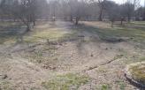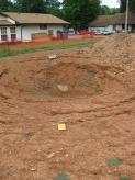 Remediating a sinkhole typically involves excavating soil materials to the bedrock surface and filling the void with size-graded material. Large rocks should be placed within and over the bedrock fracture or solution opening, with the first layer of rock sized larger in diameter than the opening. This ensures proper support is provided for overlying layers of fill. Each layer of material above the base should be successively smaller in size. Near the surface, a layer of geotextile fabric covered by topsoil may be used to complete the filling procedure. This woven material acts as a filter that allows water to pass through, but prevents infiltrating water from washing soil into the underlying fill. The area should be vegetated to help control erosion.
